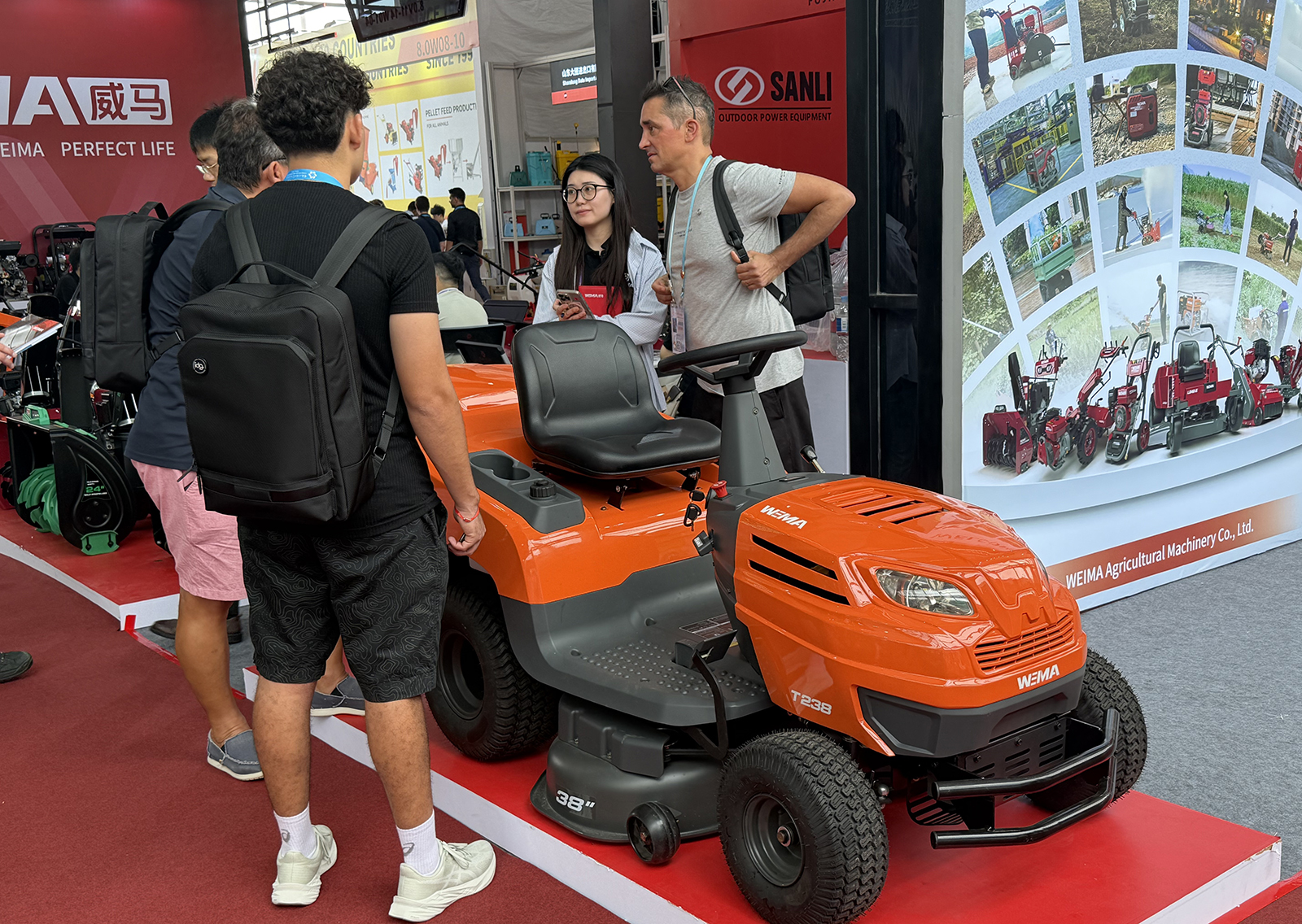 Entering the WEIMA indoor booth, a full range of products were on display: engines, water pumps, generator sets, mini tillers, riding rotary tillers, garden management machines, wood chippers, grass shredders, snow blowers, high-pressure cleaners, plate compactors, rammers, cutters, and riding lawn mowers.